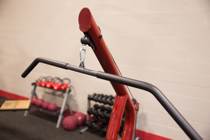 The swing arm/press arm station has a large radius to greater simulate a straight up and down motion. The press arm bar can also be raised to its highest position allowing the GLGS100 to be used as a pull-up/chin-up station.
