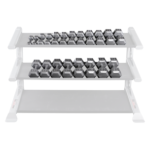 Holds 6 pairs of hex dumbbells, each level is off-set, allowing unrestricted access to dumbbells